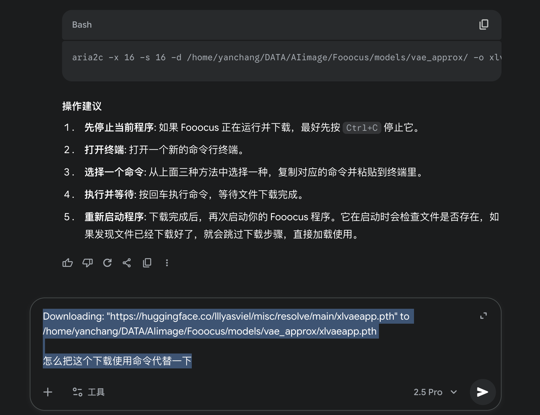 Downloading: "https://huggingface.co/lllyasviel/misc/resolve/main/xlvaeapp.pth" to /home/yanchang/DATA/AIimage/Fooocus/models/vae_approx/xlvaeapp.pth只需要一直用类似于下面的命令行代替每一个需要的模型,不会的可以找ai生成