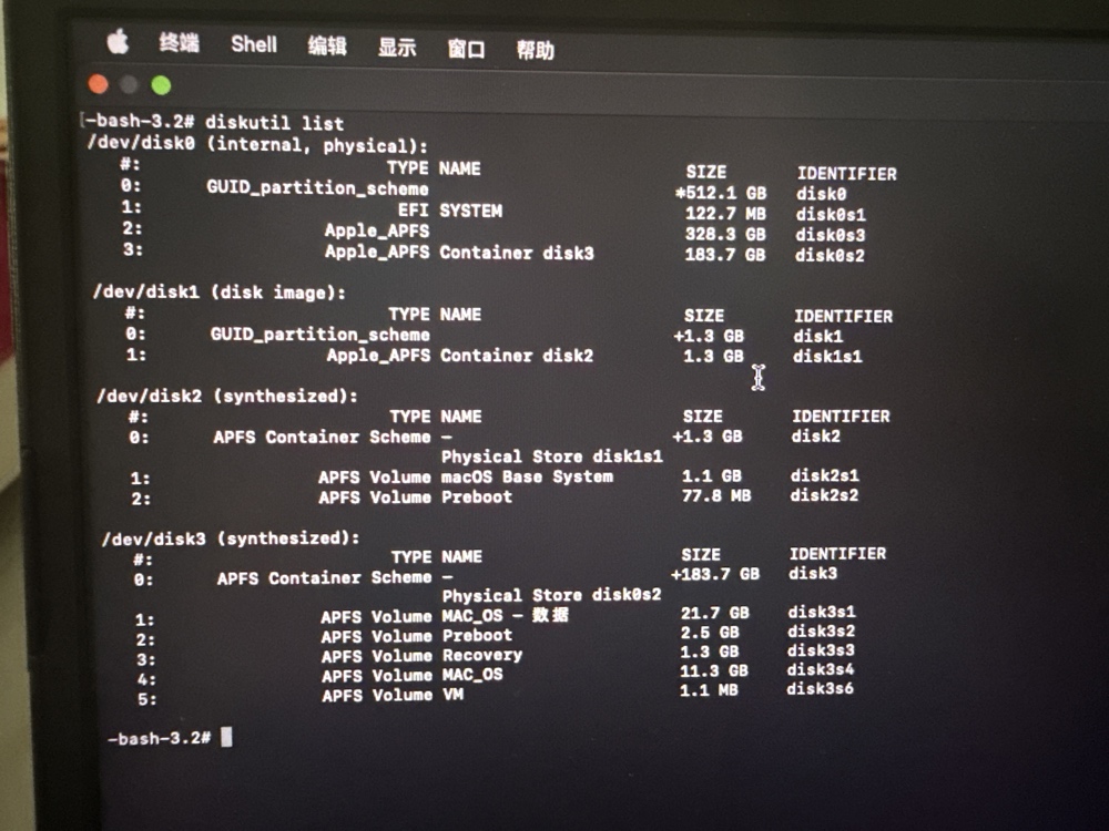 初始状态:512GB 硬盘,前部有 ~328GB 未分配空间(原 Windows/Linux 残留),后部是 ~184GB 的 macOS 系统分区。
