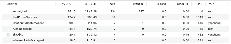 在 CPU 占用中,PerfPowerServices 始终维持在 126% 左右。这是 macOS 的电源遥测服务,它通过读取硬件传感器来记录功耗。