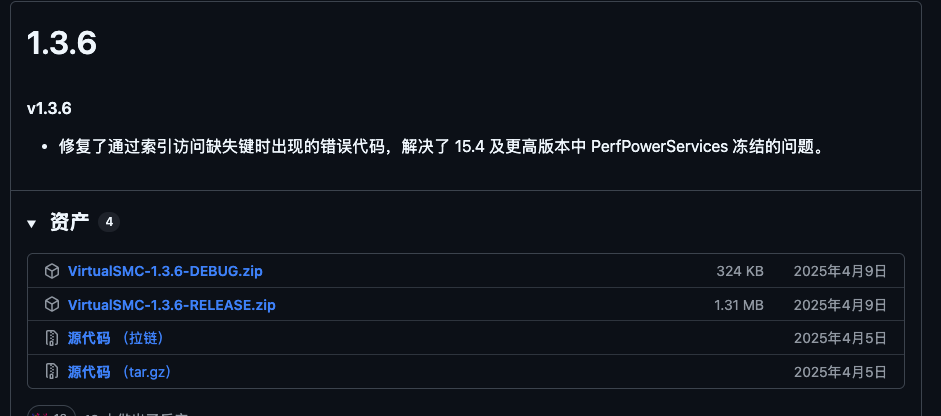 PerfPowerServices认为读取被挂起(Frozen),从而发起暴力重试。解决方案: 1. 手动下载并更新了最新的 VirtualSMC v1.3.6。 2. 该版本明确修复了“通过索引访问缺失键时的返回码错误”。 3. 同时引入