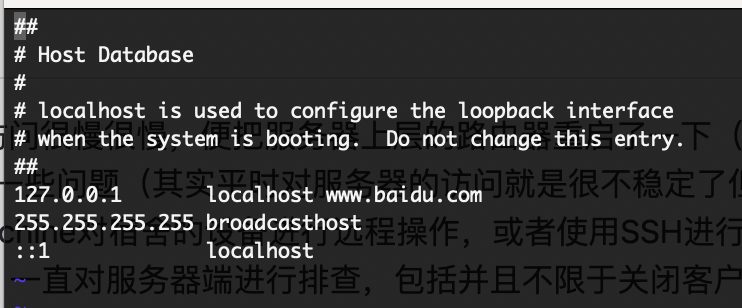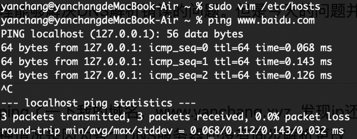 问题发现首先在于在终端中ping了一下我的域名,www.yanchang.xyz ,发现ip还是上一次路由器重启前的ip,明显和阿里云控制台中出现的解析不符合。通常来说出现这种情况是因为各个DNS服务器还没有同步解析更改,所以换一个网络或者等一会就好了。但是今天的问题有点奇怪了,我明明是可以使用浏览器访问服务的,初步猜测,浏览器难道是单独的走的DNS,然后不走系统级DNS吗?所以我做了一个小实验,修改了/etc/hosts 文件让www.baidu.com 指向127.0.0.1