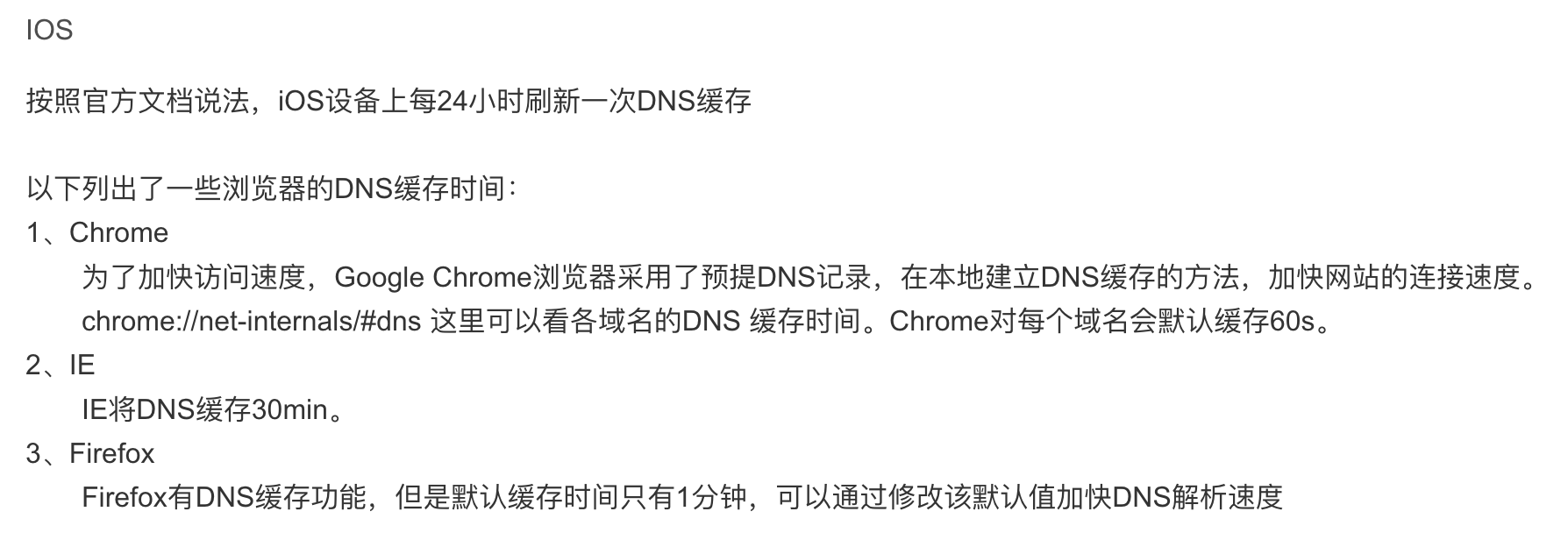 但是这里显示的是操作系统默认设置,所以说猜测,浏览器并不会去/etc/hosts下进行解析,并且浏览器此时使用的确实是系统级默认DNS,那么问题是在哪里呢,那么问题应该就在DNS缓存上了,也许此时系统DNS,也就是DNS服务器已经成功的更新解析了,但是系统级DNS缓存没更新,浏览器的DNS缓存已经更新了,所以出现了这个情况,那么此时清理一下DNS缓存也许就没问题,上网查找一下MACOS的DNS缓存策略,和清理命令。果然,DNS缓存时长ios设备长达24小时(真的晕死,为了续航都这样了吗),浏览器DNS缓存大概在1分钟左右
