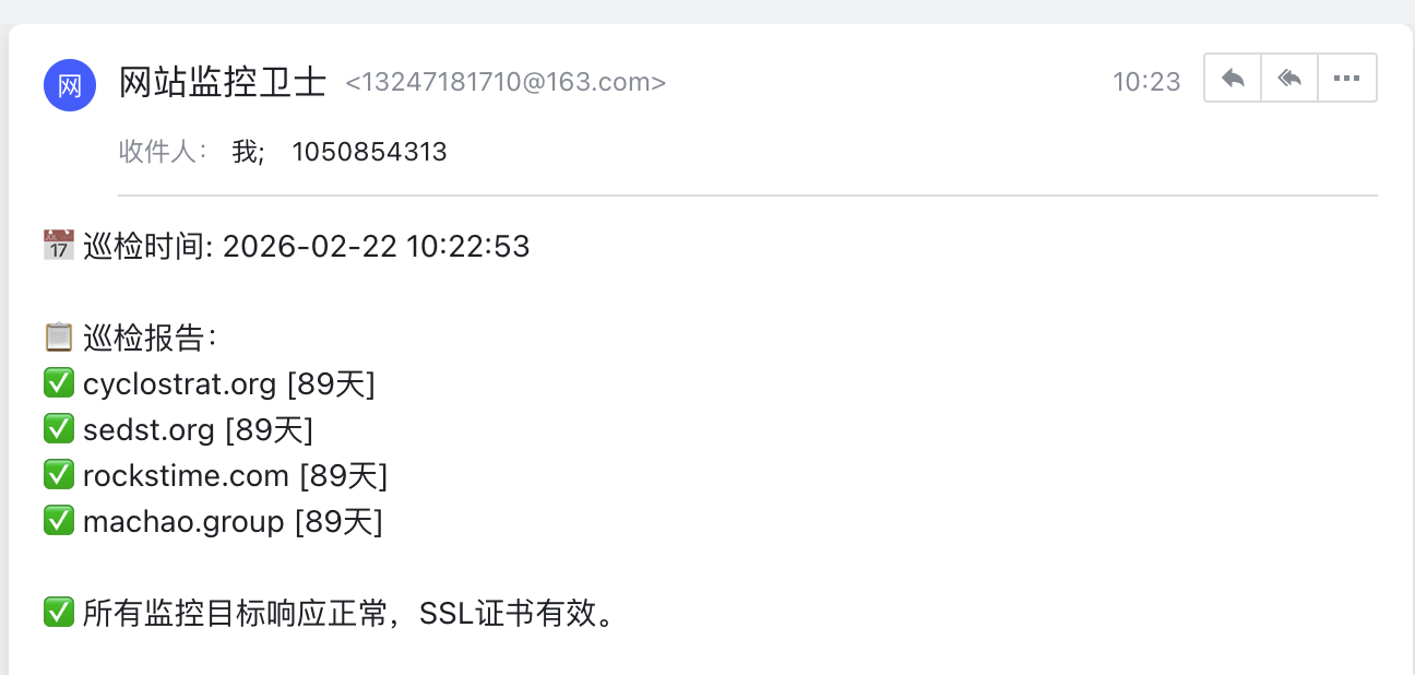 看着青龙面板里绿色的 Success 日志,以及邮箱里准时送达的合并报告,心里有一种说不出的舒坦。以后无论项目里再长出多少个 subdomain.machao.group,我只需要在数组里加个逗号,一切自动搞定。