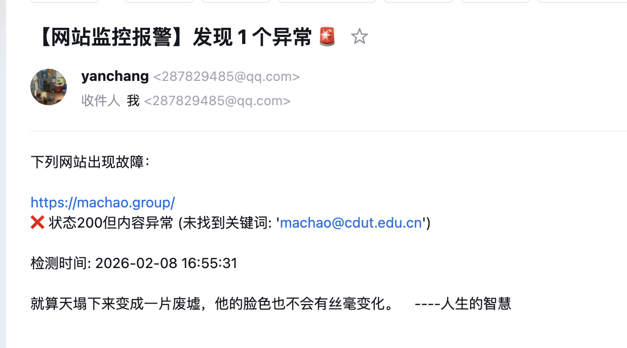 一旦有网站挂了,或者图片坏了,邮件标题会直接变成 🚨 [报警],并精确指出问题: