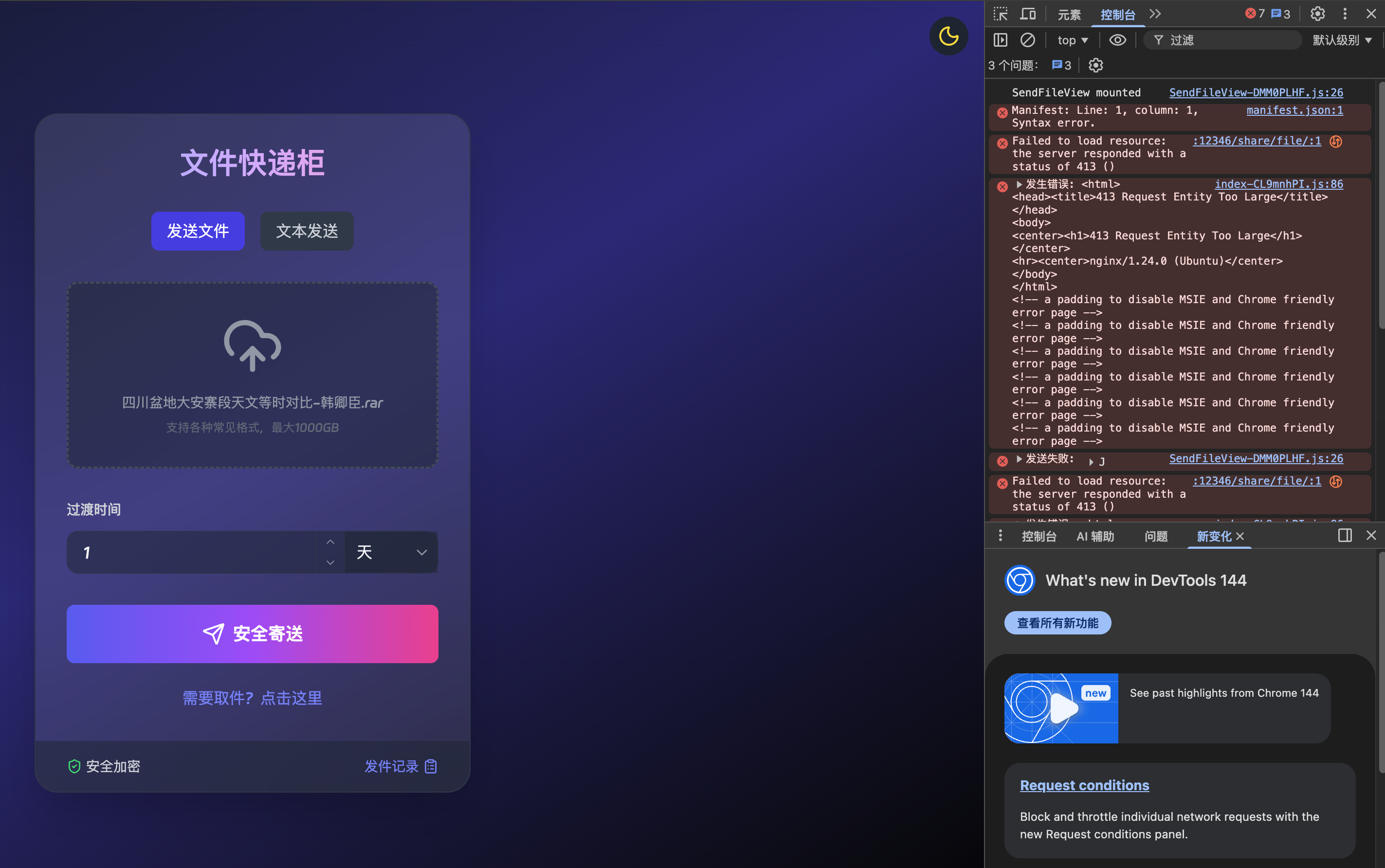 现象: 上传几 KB 的文本文件一切正常,但只要上传超过 1MB 的图片或压缩包,进度条还没开始跑就直接报红,浏览器控制台显示 413 Request Entity Too Large。