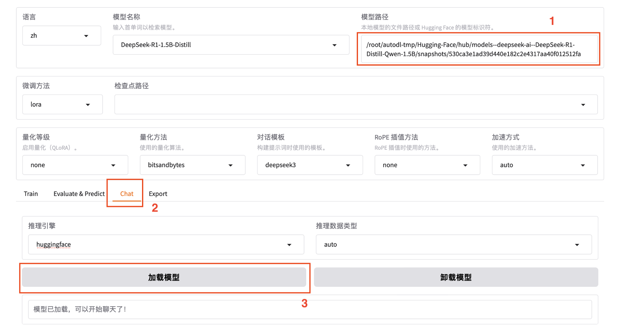 huggingface-cli download --resume-download deepseek-ai/DeepSeek-R1-Distill-Qwen-1.5B可视化页面上加载模型测试,检验是否加载成功