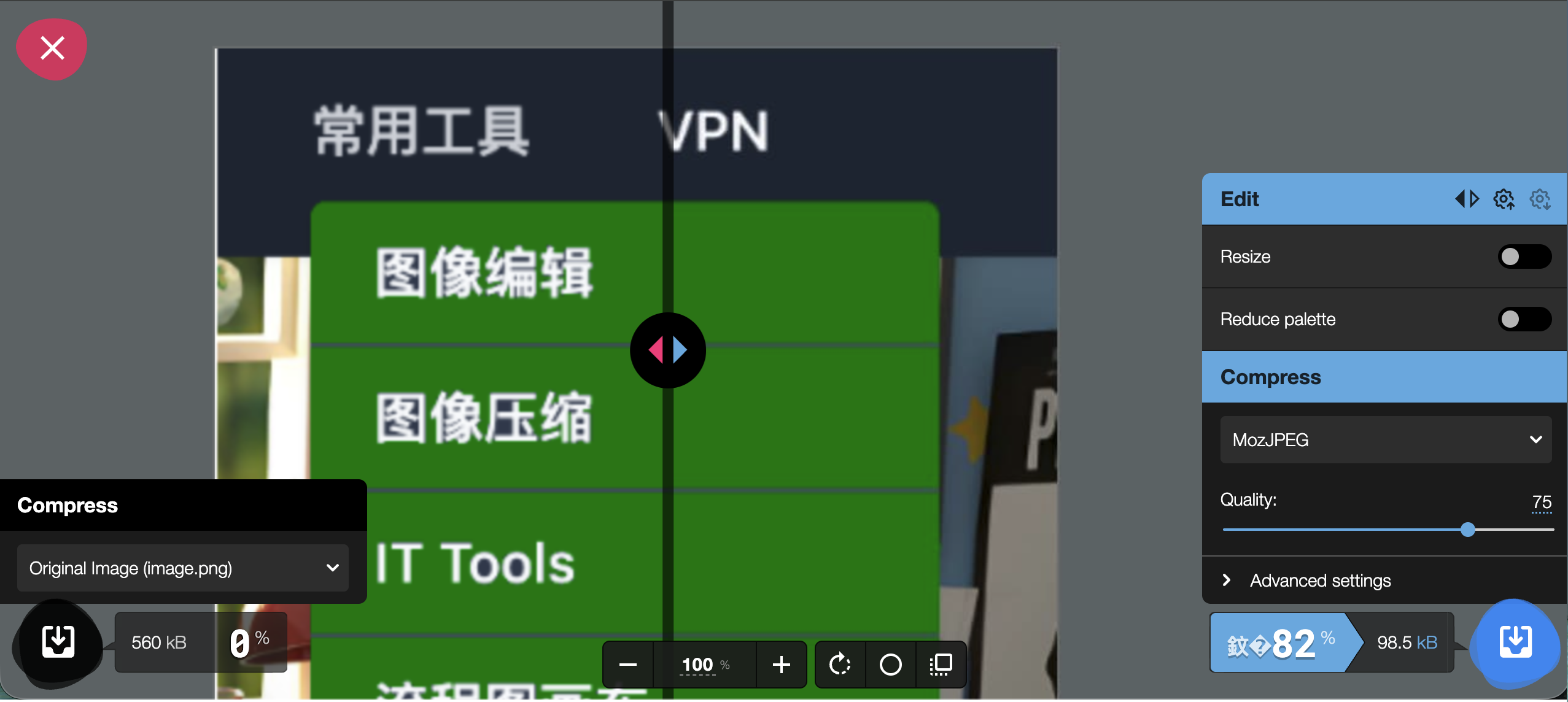 Google 出品的图片压缩神器。它依赖 WebAssembly 技术,需要先在本地进行编译。